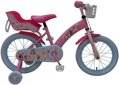 Fargerik, vakker, rosa sykkel fra Disney Princess med en heldekkende kjedebeskyttelse. Den har et avtakbart støttehjul og en håndbrems på forhjulet. Sykkelen har en sykkelklokke foran, et justerbart sete og en søt kurv i plast bak. – 16 tommer. – Anbefalt alder: fra 4 til 6 år.
