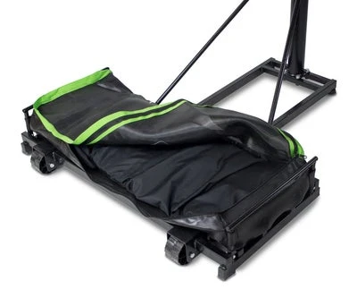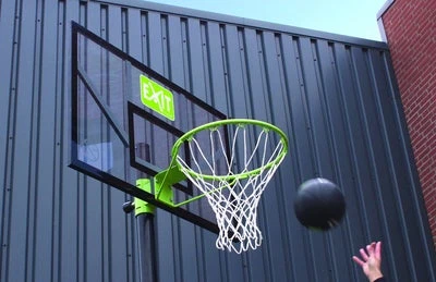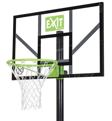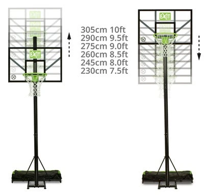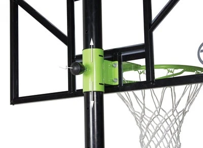 Justerbart, grønt, svart basketballstativ fra EXIT med en robust konstruksjon i pulverlakkert stål og plast. Det har lettrullende hjul for enkel bevegelse. – CE-merket– Anbefalt alder: Fra 3 til 12 år