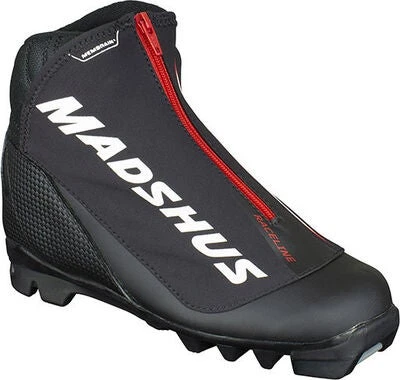 Et par skisko fra Madshus. De er perfekte til trening og lek. Skolissene går rundt hele foten for bedre stabilitet. Skoen er dekket med snøbeskyttelse av Softshellmembran som lukkes med en glidelås. Membranen isolerer, samtidig som den puster og har varmende egenskaper.