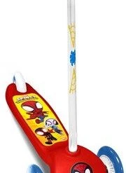 Rød, blå sparkesykkel fra Marvel med tre hjul. Den har et sklisikkert dekk og en bremse. – CE-merket– Maksimal vekt: 20.0 kg– Anbefalt alder: Fra 3 til 12 år