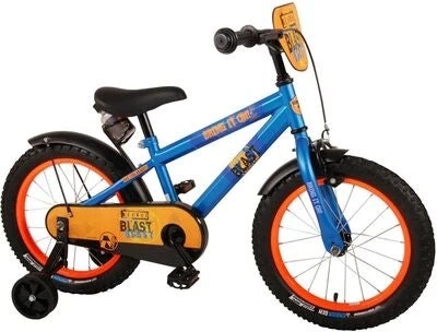 Kul, fargerik, blå, oransje sykkel fra Nerf med en heldekkende kjedebeskyttelse. Den har en håndbrems på forhjulet og avtagbare støttehjul. Sykkelen har et mykt, justerbart sete og en vannflaskeholder bak. – 16 tommer. – Anbefalt alder: fra 4 til 6 år.