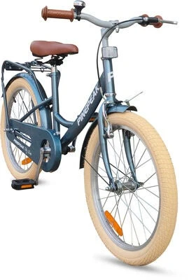 Retro City barnesykkel fra Pinepeak med en futuristisk design. Den har en livlig farge og en håndbrems. Barnesykkelen har en sykkelklokke, et bagasjebrett, en kjedebeskyttelse og reflekser. – 18 tommer. – CE-merket. – Maksimal vekt: 45 kg. – Anbefalt alder: fra 5 til 7 år. – 80 % metall, 10 % gummi, 10 % plast.