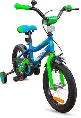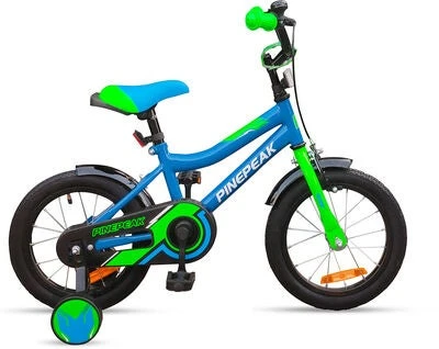 Fargerik, grønn, blå sykkel av høy kvalitet fra Pinepeak med avtagbare støttehjul. Den har en håndbrems på forhjulet og en sykkelklokke foran. Sykkelen har en synlig refleks, en heldekkende kjedebeskyttelse, et justerbart sete og ett gir. – Ett gir– 14 tommer. – Maksimal vekt: 30 kg. – Mål: H 74 x B 46 x L 98 cm. – Anbefalt alder: fra 2 til 4 år. – 80 % metall, 10 % gummi, 10 % plast.