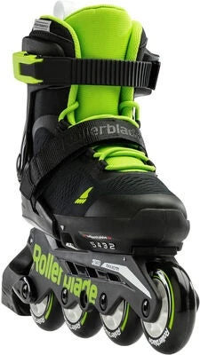 Justerbare, svarte, grønne Microblade inlineskøyter av høy kvalitet fra Rollerblade med et pustende mesh-materiale for høy komfort. De har en stabil ramme og lettrullende, utskiftbare hjul. Inlineskøytene har en sikker, stabil passform og en smidig fotbrems.