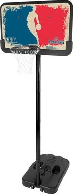 Et kult basketstativ fra Spalding. Stativet er portabelt og laget av værbestandig og rustfritt materiale. Bunnplata rommer 98 liter, og fylles med enten vann eller sand, så stativet står stabilt. Konstruksjonen er hev- og senkbar i 6 nivåer. På den måten kan du tilpasse stativet etter barnas alder og størrelse. Stolpen er en rundt teleskopstolpe i et tredelt system, for enkel håndtering.Kurvhøyden kan justeres trinnløst fra 228 – 305 cm, og backboardet er laget et økologisk komposittmateriale. Hele stativet kan flyttes. Hjulene på bunnplata gjør det lett å rulle. Anbefalt alder: 5 år +.