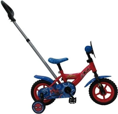 Rød, blå sykkel fra Spiderman med et praktisk, avtakbart håndtak bak. Den har avtagbare støttehjul og en heldekkende kjedebeskyttelse. Sykkelen har et justerbart sete og et justerbart styre. – 10 tommer. – Anbefalt alder: fra 2 til 4 år.