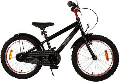 Matt svart sykkel fra Spiderman med en robust ramme. Den har en heldekkende kjedebeskyttelse med kult trykk og en håndbrems på forhjulet. Sykkelen har en sykkelklokke foran og et justerbart sete. – 18 tommer.