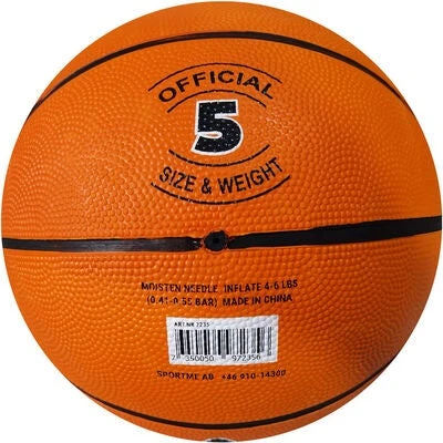 En basketball i størrelse 5, fra SportMe. Ballen er laget av gummi, og leveres uten luft i. Størrelse 5 passer barn fra 8 år og oppover.