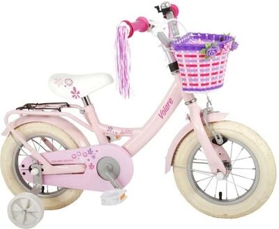 Fargerik, vakker, rosa Ashley sykkel fra Volare med en heldekkende kjedebeskyttelse. Den har et avtakbart støttehjul og en håndbrems på forhjulet. Sykkelen har en sykkelklokke foran, et justerbart sete og en søt kurv foran. – 12 tommer. – Anbefalt alder: fra 3 til 5 år.